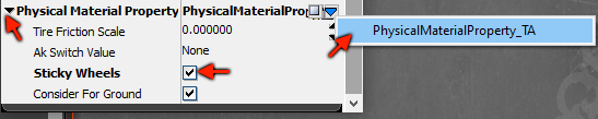 Add PhysicalMaterialProperty_TA with the blue arrow dropdown at the bottom of the next popup. Check Enable Sticky Wheels